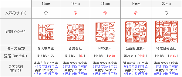 また、各サイズごとに最大彫刻文字数の目安を記載しておりますが文字数が多く、彫刻文字の潰れなど 印鑑の作成にあたってご心配な場合や、ご不明な点がある場合には事前にお問い合わせ下さいませ。