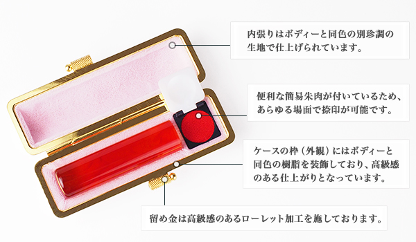 ![]() ご印鑑ケース [丸寸胴用] ファンシーレザーケース ピンク 印鑑長さ約60mm 直径13.5mm〜15mm用 簡易朱肉付き [IB-FA1502] |