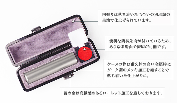 チタンの質感をイメージして作られた高級感たっぷりの硬質プラスチックボディの印鑑ケースです。