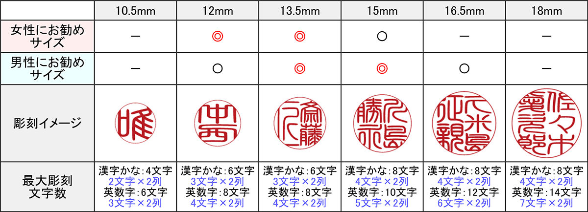 また、各サイズごとに最大彫刻文字数の目安を記載しておりますが、文字数が多く印鑑の作成にあたって ご心配な場合は事前にお問い合わせ下さいませ。