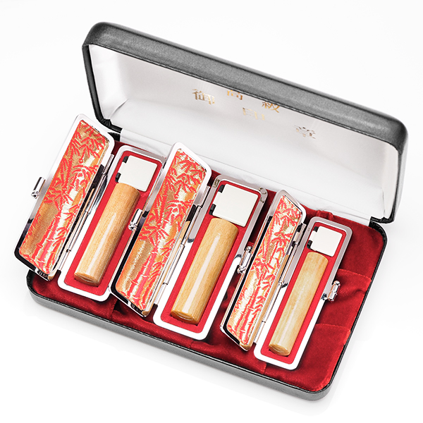 個人印鑑3本[手彫り仕上げ]・オノオレカンバ(アタリ無し)・エンボスオーストリッチケーススリムセット+エクセレントセットケース