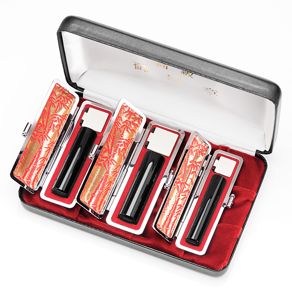 個人印鑑3本[手彫り仕上げ]・黒水牛特上(アタリ有無選択可能)・エンボスオーストリッチケースラグジュアリーセット+エクセレントセットケース