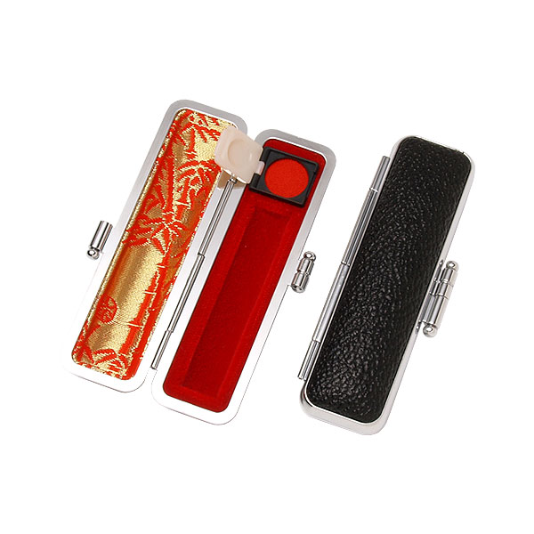 ご印鑑ケース[丸寸胴用]・もみ革ケース(外装ブラック・内張:朱竹)・印鑑長さ約60mm・直径10.5mm〜12mm用・簡易朱肉付き