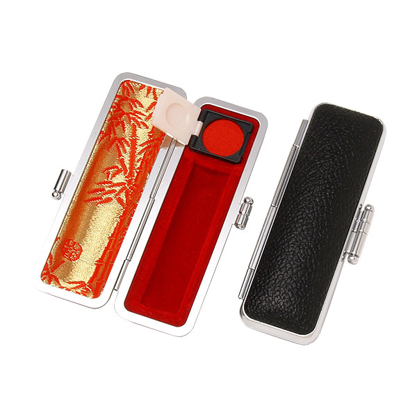 ご印鑑ケース[丸寸胴用]・もみ革ケース(外装ブラック・内張:朱竹)・印鑑長さ約60mm・直径13.5mm〜15mm用・簡易朱肉付き