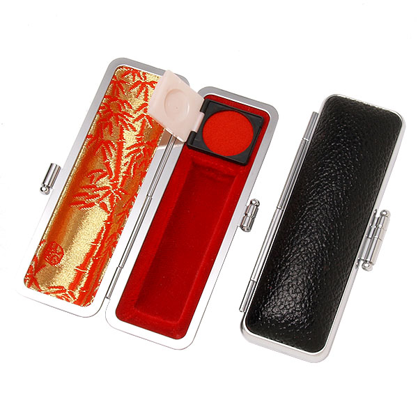 ご印鑑ケース[丸寸胴用]・もみ革ケース(外装ブラック・内張:朱竹)・印鑑長さ約60mm・直径16.5mm〜18mm用・簡易朱肉付き