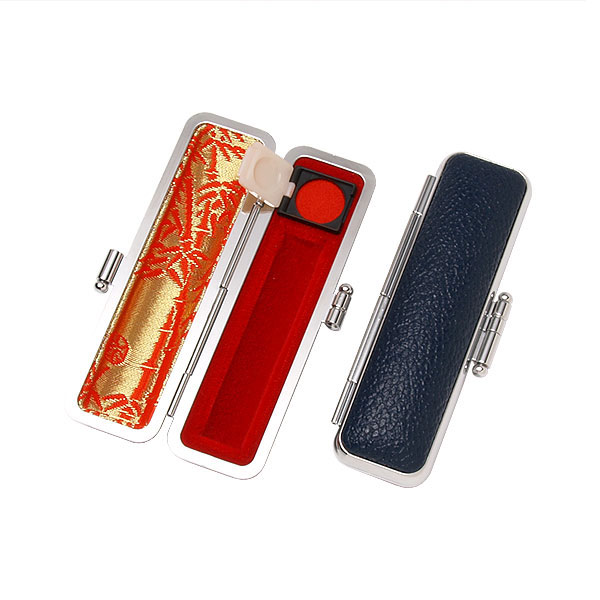 ご印鑑ケース[丸寸胴用]・もみ革ケース(外装ブルー・内張:朱竹)・印鑑長さ約60mm・直径10.5mm〜12mm用・簡易朱肉付き