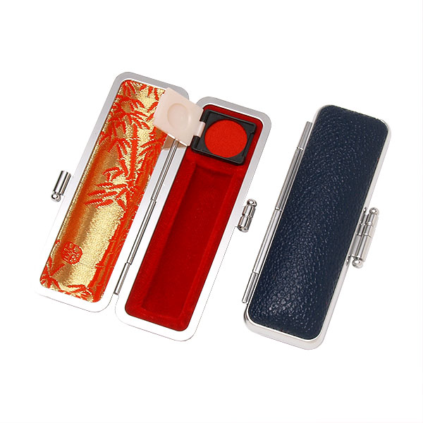 ご印鑑ケース[丸寸胴用]・もみ革ケース(外装ブルー・内張:朱竹)・印鑑長さ約60mm・直径13.5mm〜15mm用・簡易朱肉付き