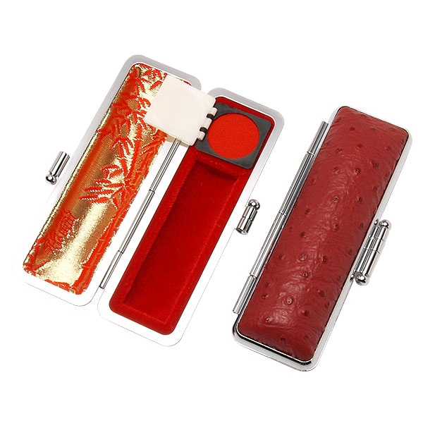 ご印鑑ケース[丸寸胴用]・エンボスオーストリッチケース(カンパリ)・印鑑長さ約60mm・直径16.5mm〜18mm用・簡易朱肉付き