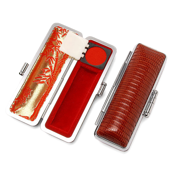 | 天然トカゲの表革を使用した高級印鑑ケース。 | 内張りには縁起物の朱竹柄が刺繍されています。 |