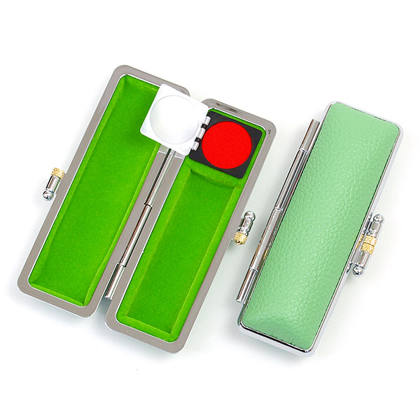 ご印鑑ケース[丸寸胴用]・ネオクロームケース・牛もみ革(外装ライトグリーン・内張ライム)印鑑長さ約60mm・印面直径16.5mm〜18mm用・簡易朱肉付き