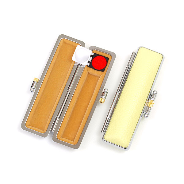 ご印鑑ケース[丸寸胴用]・ネオクロームケース・牛もみ革(外装レモンイエロー・内張キャラメル)印鑑長さ約60mm・印面直径10.5mm〜12mm用・簡易朱肉付き