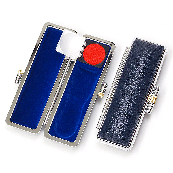 ご印鑑ケース[丸天丸用]・ネオクローム法人印鑑ケース・牛もみ革(外装ブルー・内張ネイビー)印鑑長さ約60mm・印面直径16.5mm〜18mm用・簡易朱肉付き