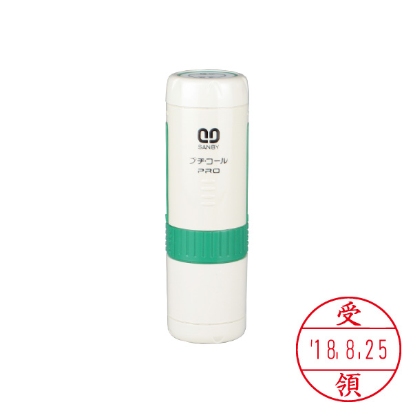 サンビー・プチコールPRO15(日付印)・元号・略西暦表示・印面直径:15mm(既製品・記帳用タイプ)【受領】・キャップ式・グリーン[SANBY・PETIT CALL PRO・PTP-15H]
