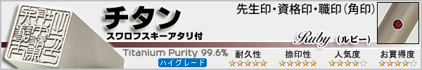 ![]() シルバーブラスト チタン 先生印 資格印・職印 角天丸 スワロフスキー アタリ付 ルビー 60x18mm \22,800(税込) |