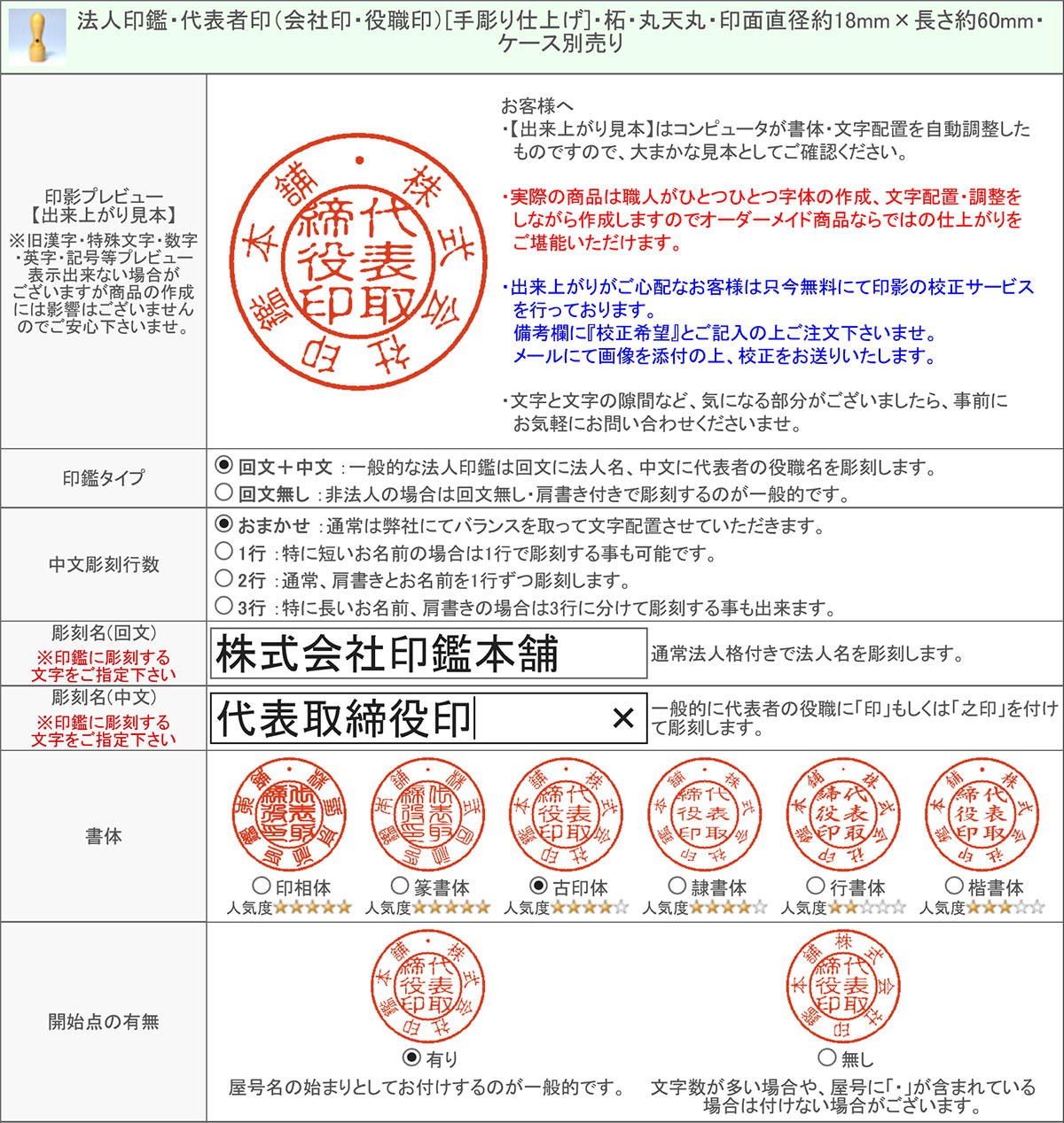 実際の印影は弊社職人による手作りとなり、字体、スペース、文字配置のバランス等を十分考慮した 出来上がりとなり、印影プレビューのイメージとは変わってまいりますことを予めご了承下さい。