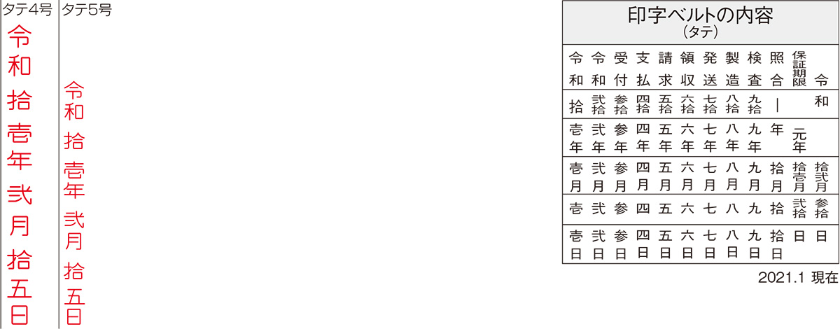和文日付タイプは「年号」や「月」、「日」、他にも事務作業に使える内容を捺印出来るタイプで、 さまざまな用途にお使いいただけます。また、横読みと縦読みのバリエーションもあり、書体は読みやすい ゴシック体となっております。