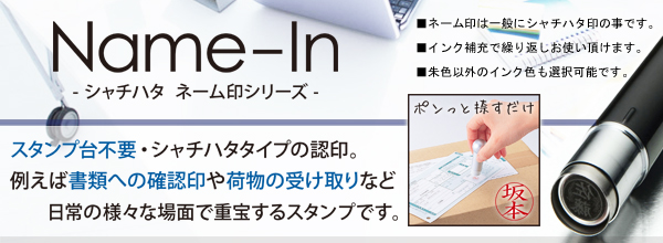 ネーム印とは一般的にスタンプ台の要らないシャチハタタイプの認印の事です。 |