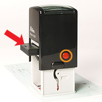 プラスチック製の本体にスタンプ台(矢印)が内蔵されています。 下に押しながら本体横の赤いボタンを押すことにより下記の画像の状態で固定することができます。 |
