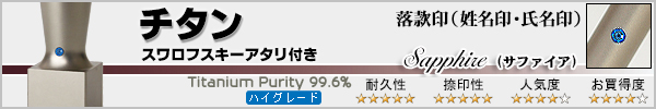 ![]() シルバーブラスト チタン 角天丸 落款印 姓名印・氏名印 スワロフスキー アタリ付 サファイア 印面:約24x24mm 長さ:約60mm \26,800(税込) |