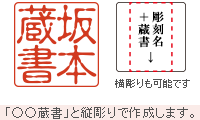 蔵書印(ぞうしょいん)とは本や書画などに所有者の証として 捺印する印鑑を指します。 彫刻する内容は、所有者の名前や号の後に「蔵書」などを 加えた形が多くみられます。 また、文字数のバランスを取る為、語尾に「印」や「之印」を 加える場合もございます。 |